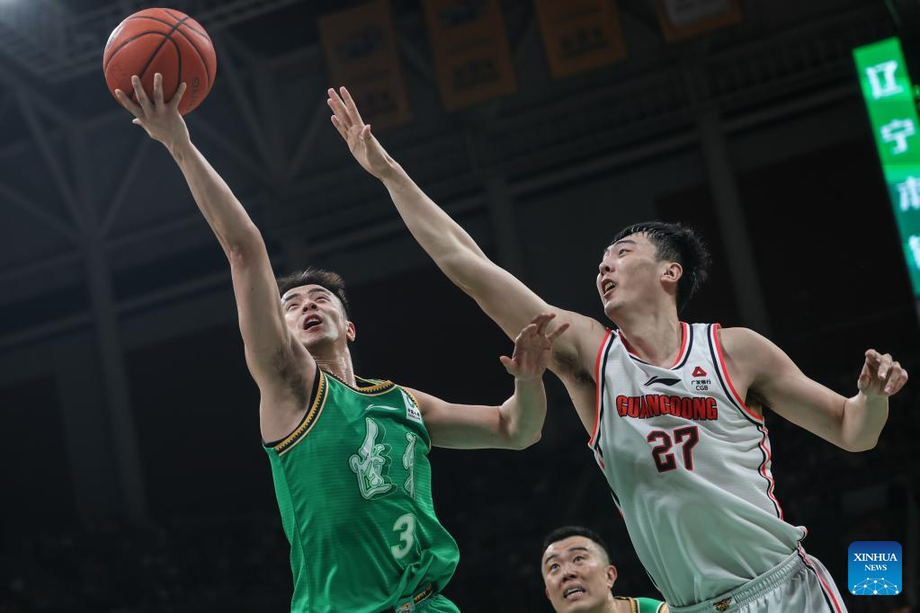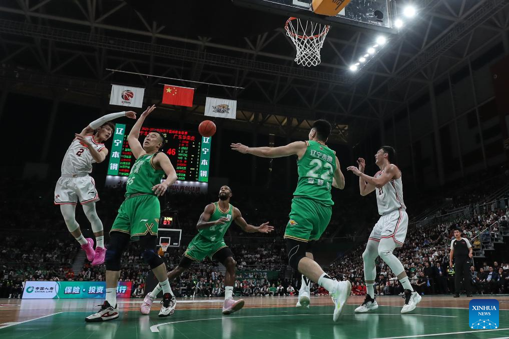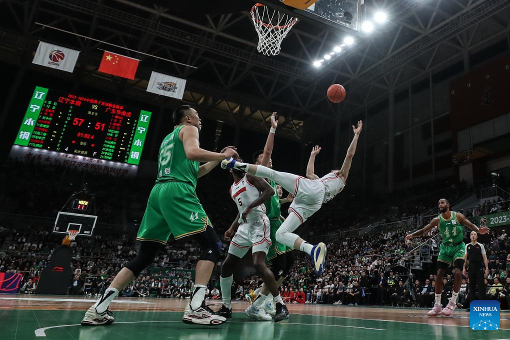 Hu Mingxuan (2nd R) of Guangdong Southern Tigers goes for a lay up and falls during the play-off semifinal first leg match between Liaoning Flying Leopards and Guangdong Southern Tigers at the 2023-2024 season of the Chinese Basketball Association (CBA) league in Shenyang, northeast China's Liaoning Province, May 1, 2024. (Xinhua/Pan Yulong)