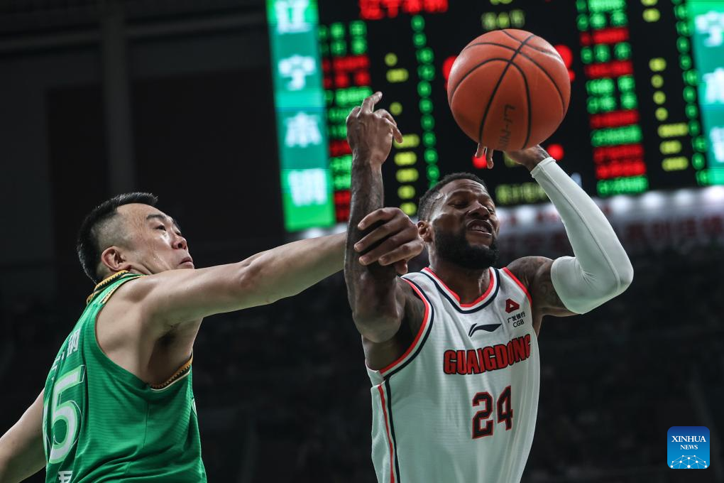 Kyle Fogg (L) of Liaoning Flying Leopards vies with Xu Jie of Guangdong Southern Tigers during the play-off semifinal first leg match between Liaoning Flying Leopards and Guangdong Southern Tigers at the 2023-2024 season of the Chinese Basketball Association (CBA) league in Shenyang, northeast China's Liaoning Province, May 1, 2024. (Xinhua/Pan Yulong)
