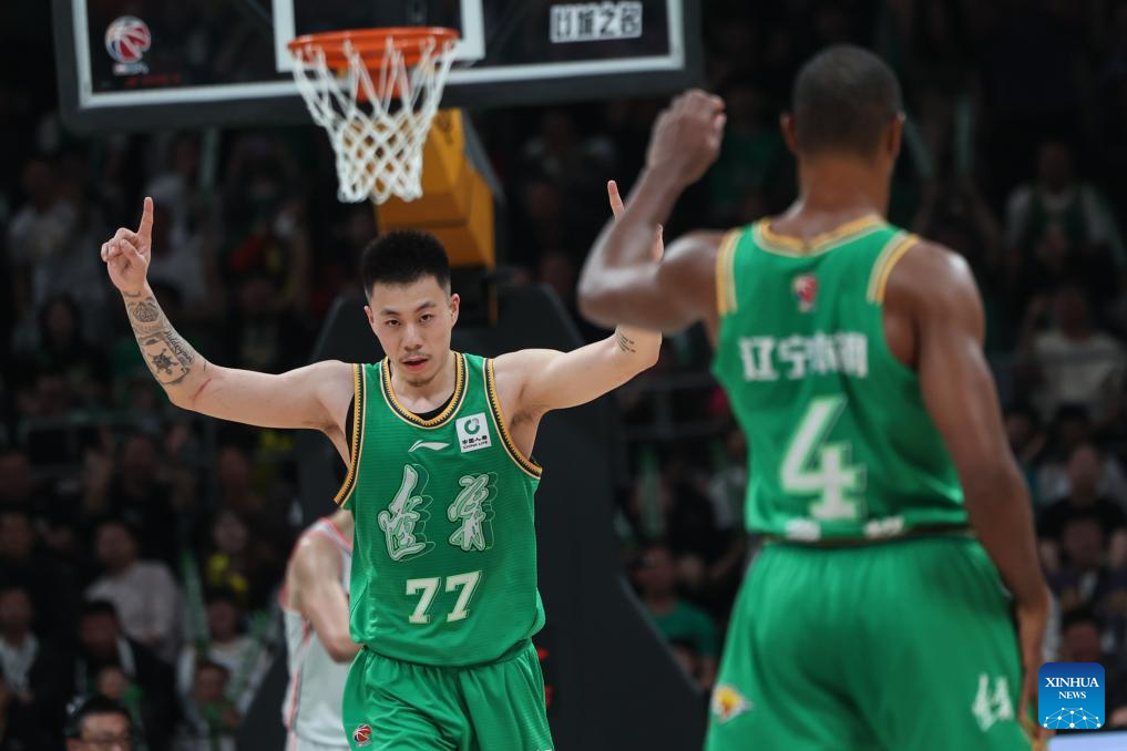 Zhang Zhenlin (L) of Liaoning Flying Leopards celebrates scoring during the play-off semifinal first leg match between Liaoning Flying Leopards and Guangdong Southern Tigers at the 2023-2024 season of the Chinese Basketball Association (CBA) league in Shenyang, northeast China's Liaoning Province, May 1, 2024. (Xinhua/Pan Yulong)