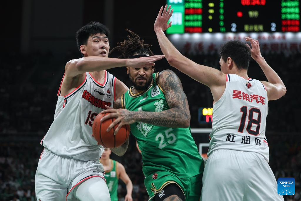 Eric Moreland (C) of Liaoning Flying Leopards breaks through past Du Runwang (R) and Xu Xin of Guangdong Southern Tigers during the play-off semifinal first leg match between Liaoning Flying Leopards and Guangdong Southern Tigers at the 2023-2024 season of the Chinese Basketball Association (CBA) league in Shenyang, northeast China's Liaoning Province, May 1, 2024. (Xinhua/Pan Yulong)
