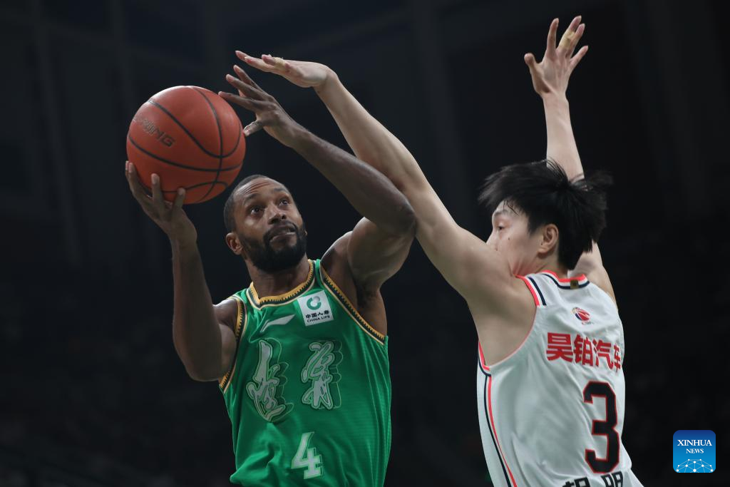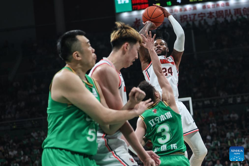 Eric Moreland (R) of Liaoning Flying Leopards competes during the play-off semifinal second leg match between Liaoning Flying Leopards and Guangdong Southern Tigers at the 2023-2024 season of the Chinese Basketball Association (CBA) league in Shenyang, northeast China's Liaoning Province, May 3, 2024. (Xinhua/Pan Yulong)