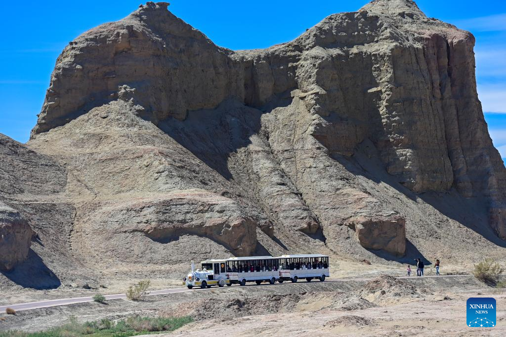 Tourists take a sightseeing car at a scenic area in Urho District of Karamay, northwest China's Xinjiang Uygur Autonomous Region, May 2, 2024. During the May Day holiday, Urho District of Karamay City has become a popular travel destination for tourists from all over the country. Various activities such as low-altitude flight, no-man's land crossing, RV camping, and off-road motorcycling have been carried out here to meet the diverse and personalized needs of tourists.