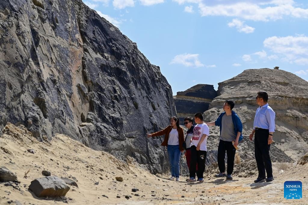 Tourists view asphalt ore in Urho District of Karamay, northwest China's Xinjiang Uygur Autonomous Region, May 1, 2024. During the May Day holiday, Urho District of Karamay City has become a popular travel destination for tourists from all over the country. Various activities such as low-altitude flight, no-man's land crossing, RV camping, and off-road motorcycling have been carried out here to meet the diverse and personalized needs of tourists.