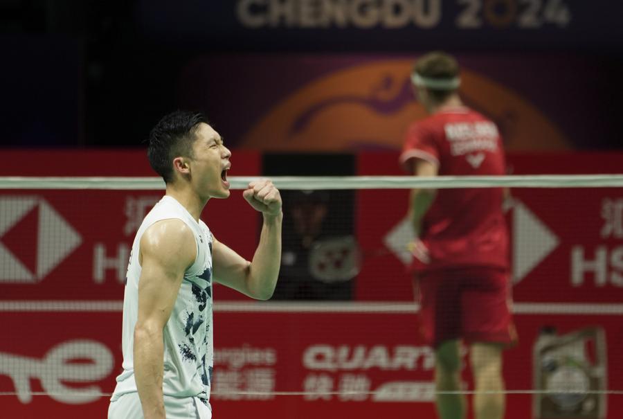 CHENGDU, China, May 3 (Xinhua) -- Chou Tien-chen stunned world No. 1 Viktor Axelsen on Friday as Chinese Taipei ousted Denmark 3-1 to reach the Thomas Cup semifinals.