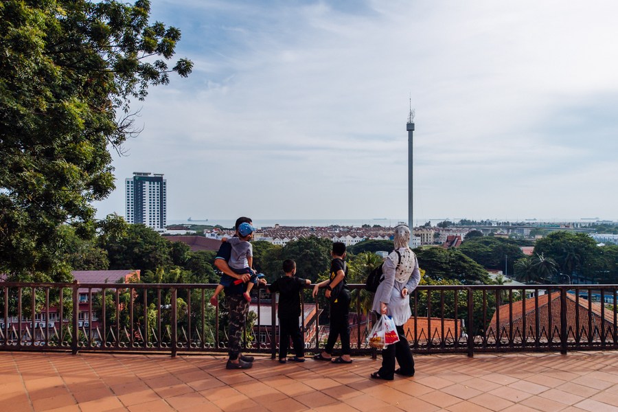 Tourists overlook the Malacca Strait on the St. Paul's Hill in Malacca, Malaysia, Sept. 18, 2020. (Xinhua/Zhu Wei)
