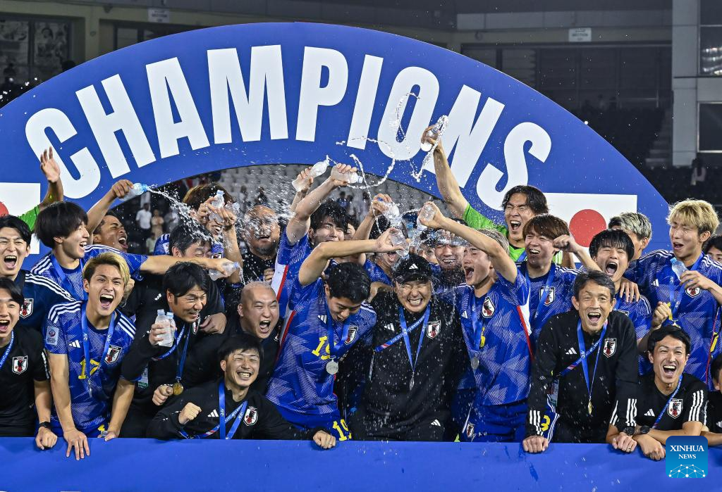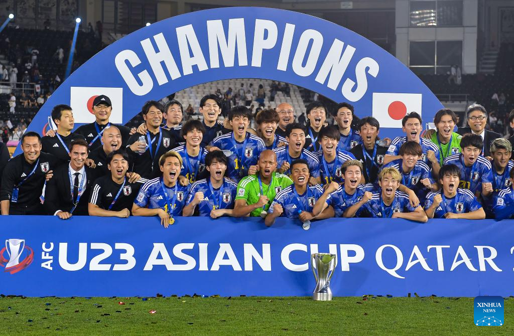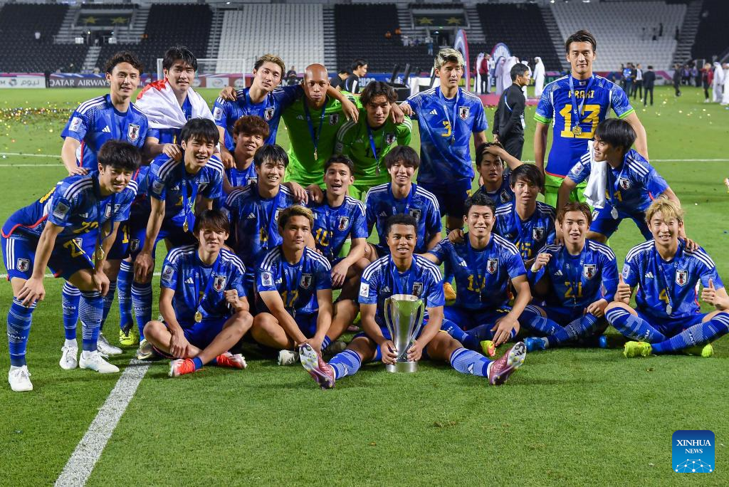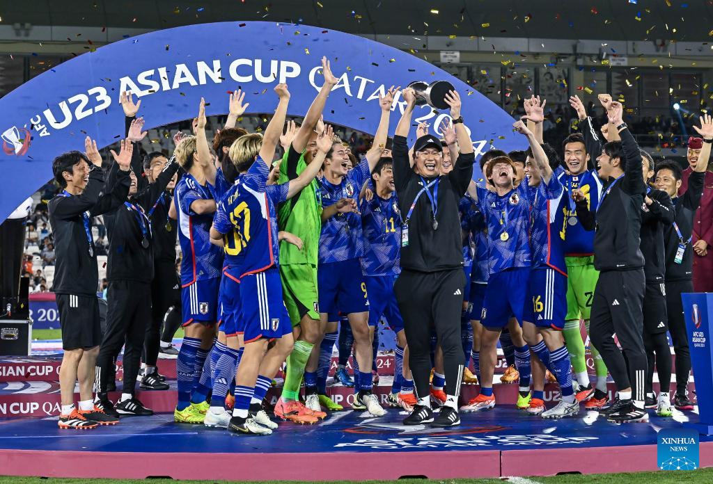 Team Japan celebrate during the awarding ceremony after the final match between Japan and Uzbekistan at AFC U23 Asian Cup Qatar 2024 football tournament in Doha, Qatar, on May 3, 2024. (Photo by Nikku/Xinhua)