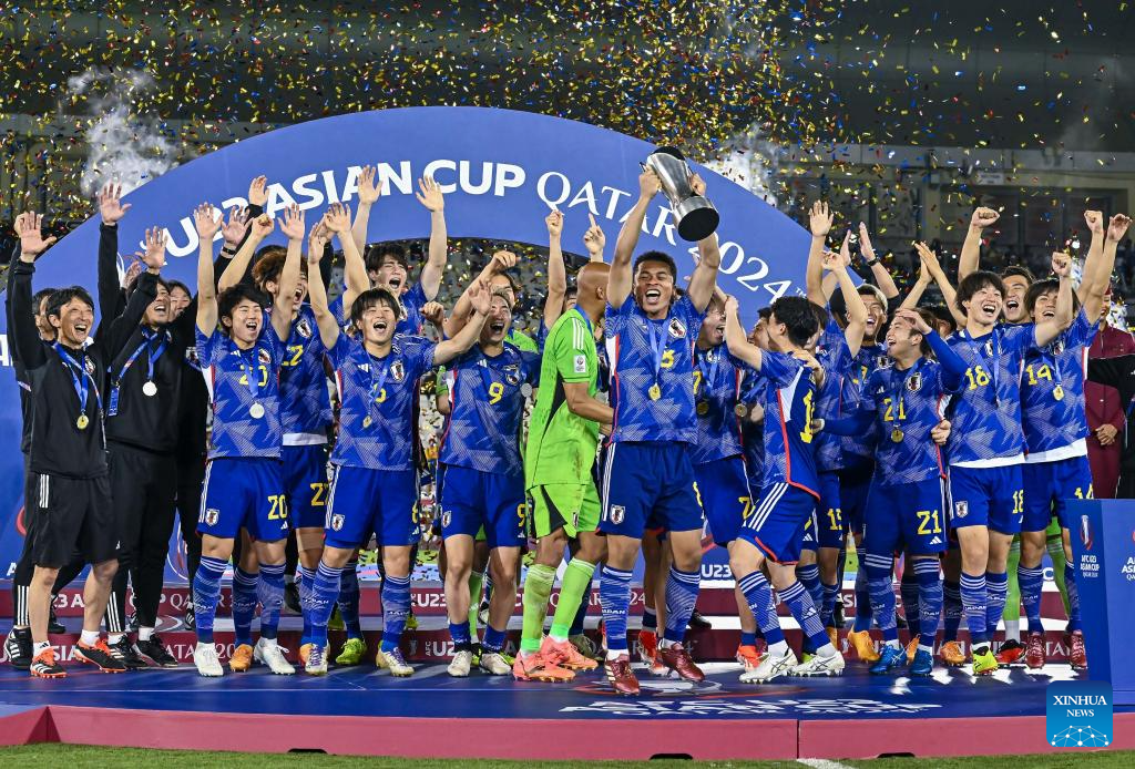 Players of Japan celebrate with the trophy after the final match between Japan and Uzbekistan at AFC U23 Asian Cup Qatar 2024 football tournament in Doha, Qatar, on May 3, 2024. (Photo by Nikku/Xinhua)