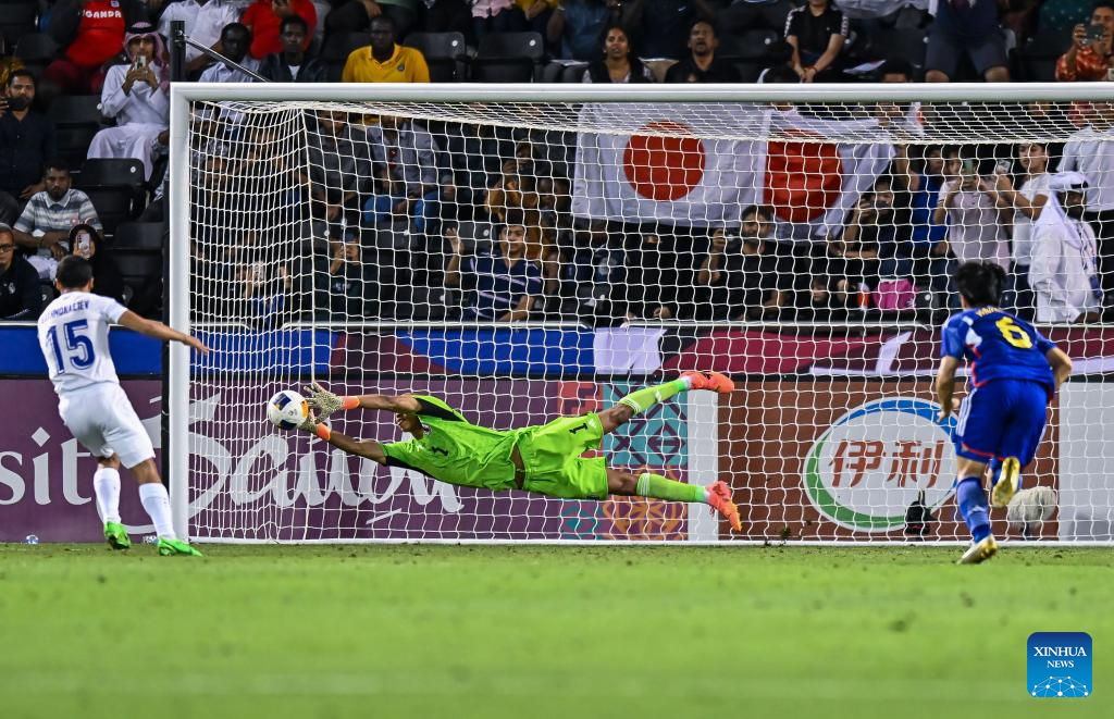 Kokubo Leobrian (C) of Japan saves the penalty from Umarali Rakhmonaliev (L) of Uzbekistan during the final match between Japan and Uzbekistan at AFC U23 Asian Cup Qatar 2024 football tournament in Doha, Qatar, on May 3, 2024. (Photo by Nikku/Xinhua)