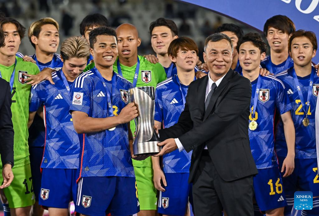 Fujita Joel Chima (L, front) of Japan receives the AFC U23 Asian Cup trophy after the final match between Japan and Uzbekistan at AFC U23 Asian Cup Qatar 2024 football tournament in Doha, Qatar, on May 3, 2024. (Photo by Nikku/Xinhua)