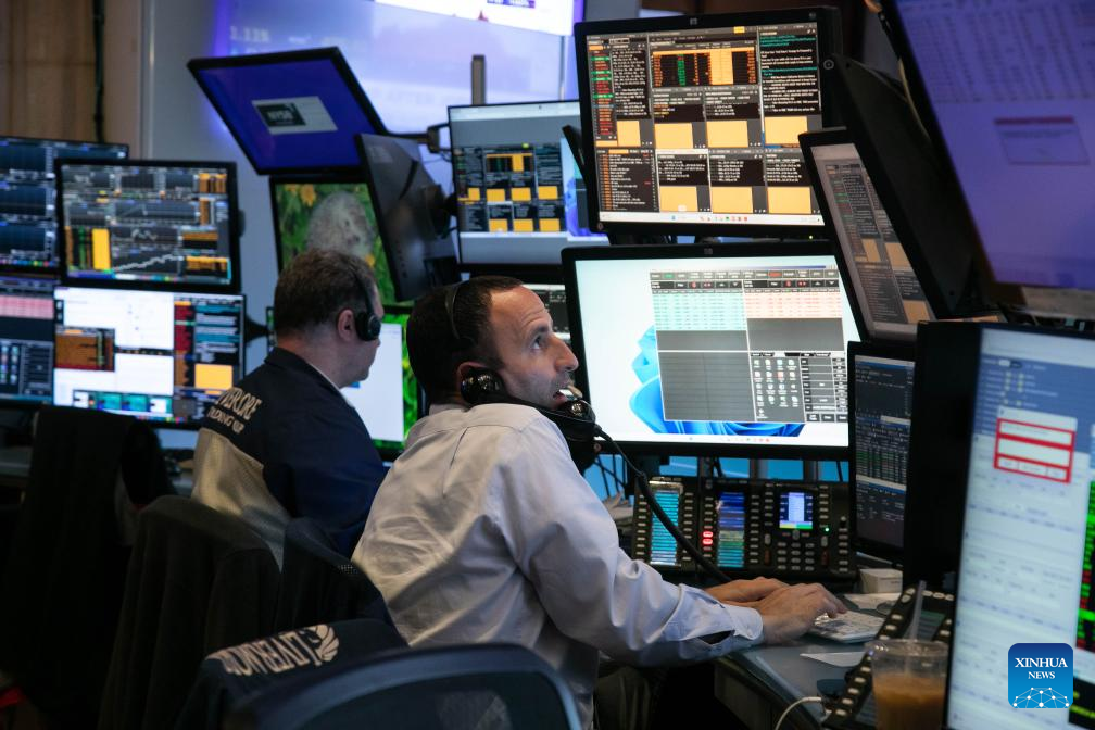 Traders work on the floor of the New York Stock Exchange (NYSE) in New York, the United States, on May 3, 2024. U.S. stocks ended higher on Friday. The Dow Jones Industrial Average rose 450.02 points, or 1.18 percent, to 38,675.68. The S&P 500 added 63.59 points, or 1.26 percent, to 5,127.79. The Nasdaq Composite Index increased by 315.37 points, or 1.99 percent, to 16,156.33. (Photo by Michael Nagle/Xinhua)