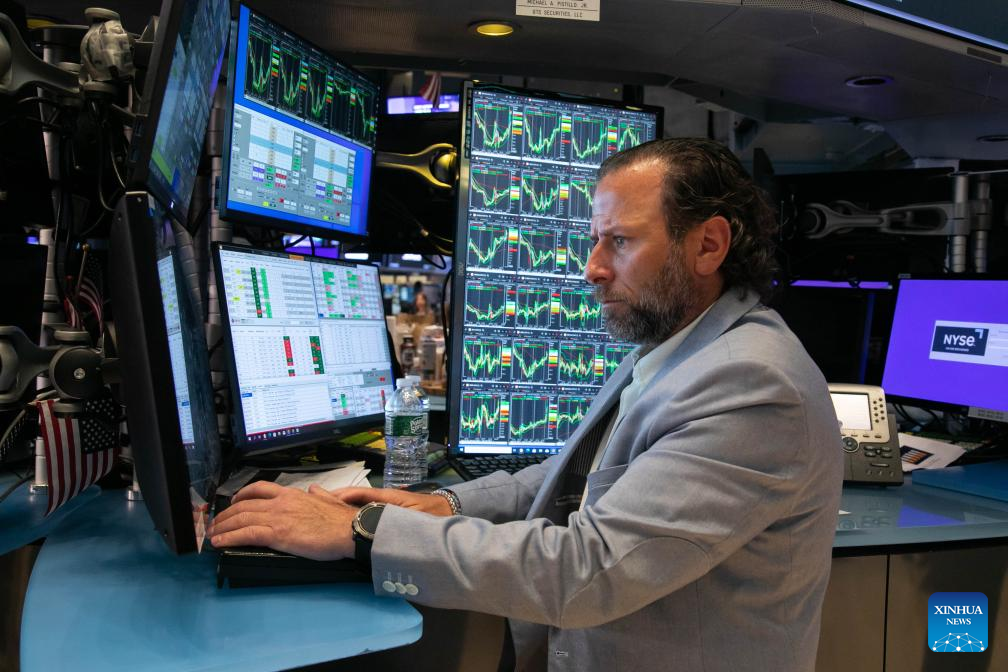 A trader works on the floor of the New York Stock Exchange in New York, the United States, on May 3, 2024. U.S. stocks ended higher on Friday. The Dow Jones Industrial Average rose 450.02 points, or 1.18 percent, to 38,675.68. The S&P 500 added 63.59 points, or 1.26 percent, to 5,127.79. The Nasdaq Composite Index increased by 315.37 points, or 1.99 percent, to 16,156.33. (Photo by Michael Nagle/Xinhua)