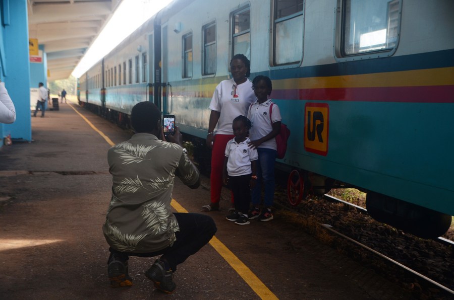 Passengers pose for photos at a train station in Kampala, Uganda, May 2, 2024. (Photo by Nicholas Kajoba/Xinhua)