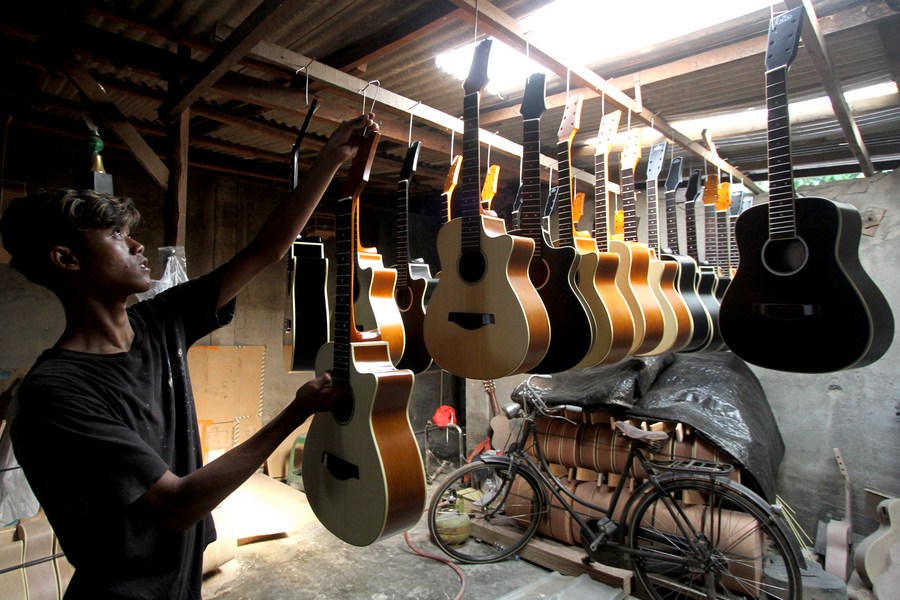 A view of a guitar workshop in Baki subdistrict, Sukoharjo Regency, Central Java, Indonesia, May 2, 2024. (Photo by Bram Selo/Xinhua)