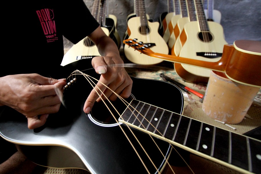 An employee conducts guitar tone test at a guitar workshop in Baki subdistrict, Sukoharjo Regency, Central Java, Indonesia, May 2, 2024. (Photo by Bram Selo/Xinhua)