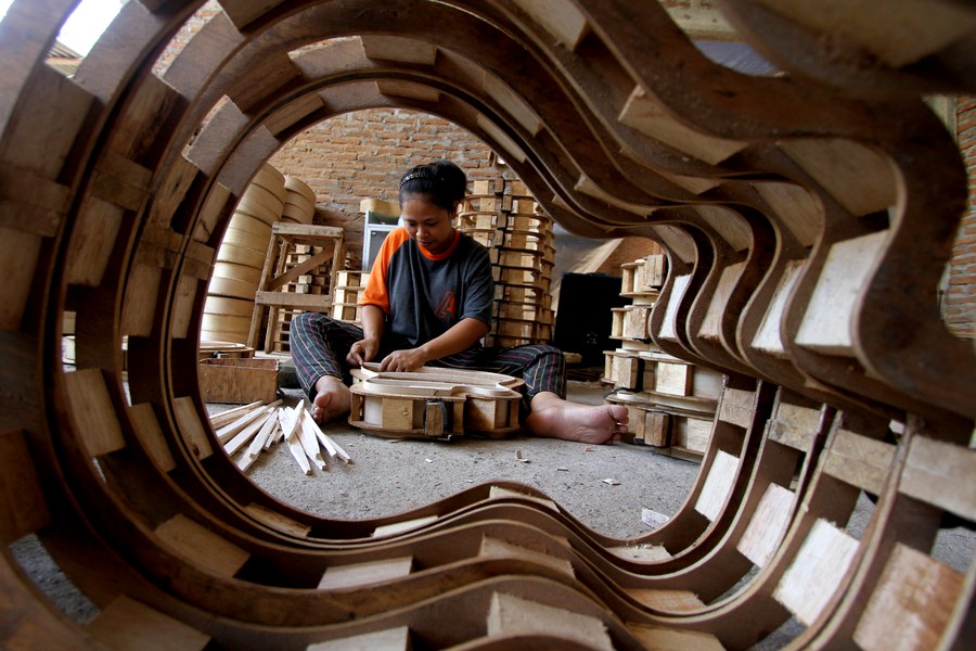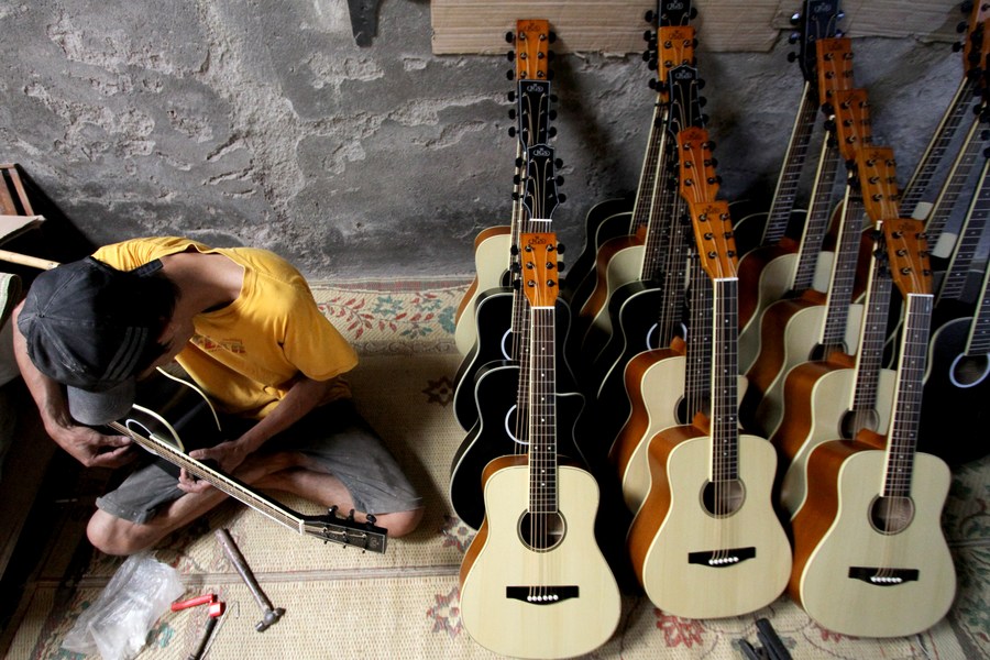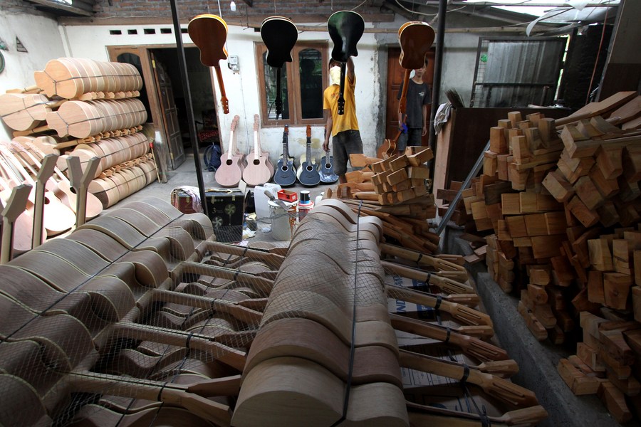 Employees work at a guitar workshop in Baki subdistrict, Sukoharjo Regency, Central Java, Indonesia, May 2, 2024. (Photo by Bram Selo/Xinhua) ■