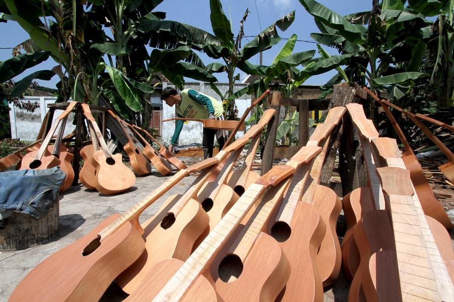 SUKOHARJO, Indonesia, May 4 (Xinhua) -- Under the careful polishing and production of craftsmen, various types of guitars come out at a guitar workshop in Baki subdistrict of Indonesia's Central Java province.