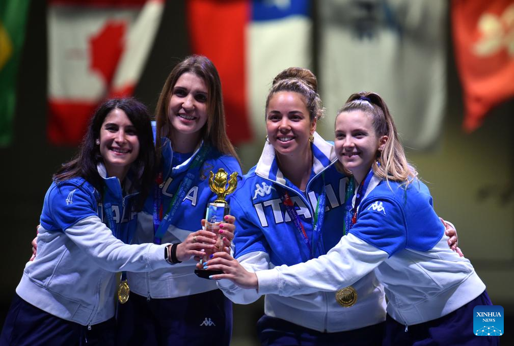 Team Italy pose during the awarding ceremony after the women's senior foil team final against France at the 2024 FIE Foil World Cup in Hong Kong, south China, May 4, 2024. (Xinhua/Lo Ping Fai)