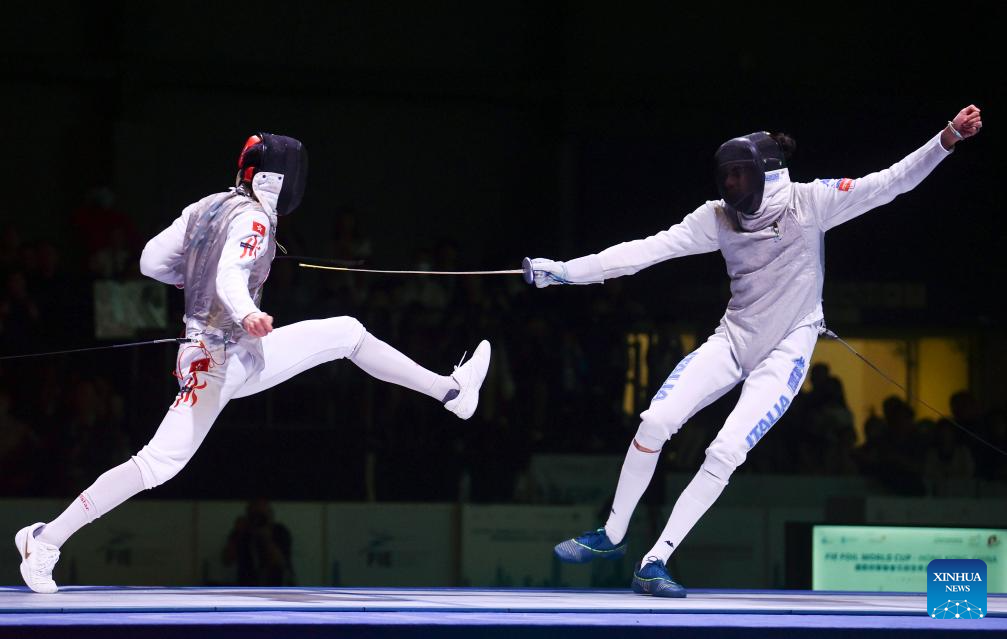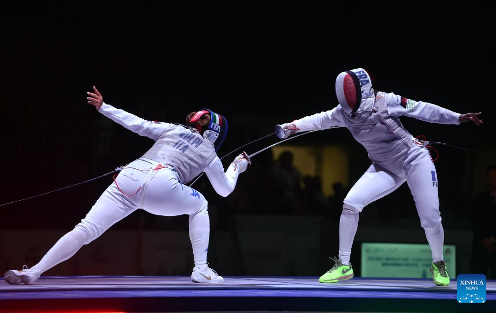 Volpi Alice (L) of Italy competes against Blaze Anita of France during the women's senior foil team final at the 2024 FIE Foil World Cup in Hong Kong, south China, May 4, 2024. (Xinhua/Lo Ping Fai)