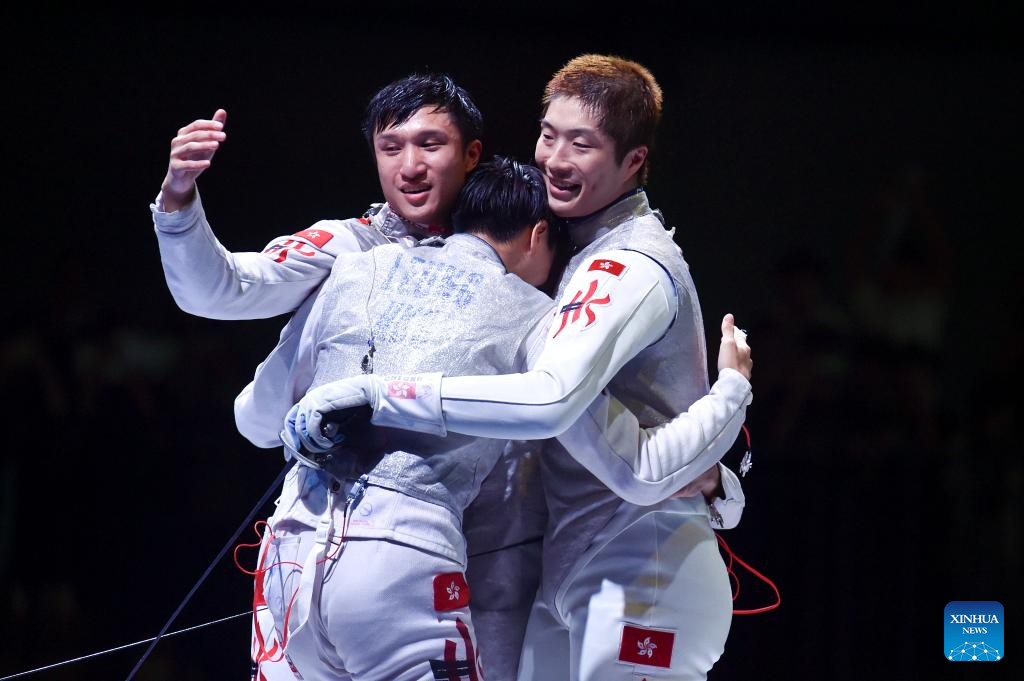Team China's Hong Kong celebrate after the men's senior foil team final against Italy at the 2024 FIE Foil World Cup in Hong Kong, south China, May 4, 2024. (Xinhua/Lo Ping Fai)