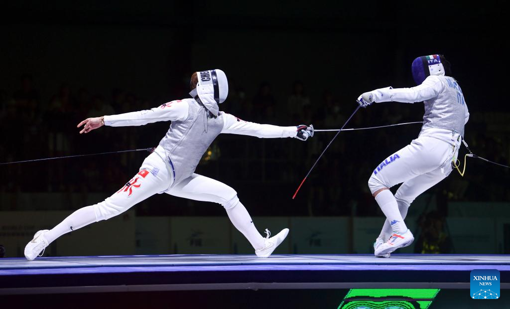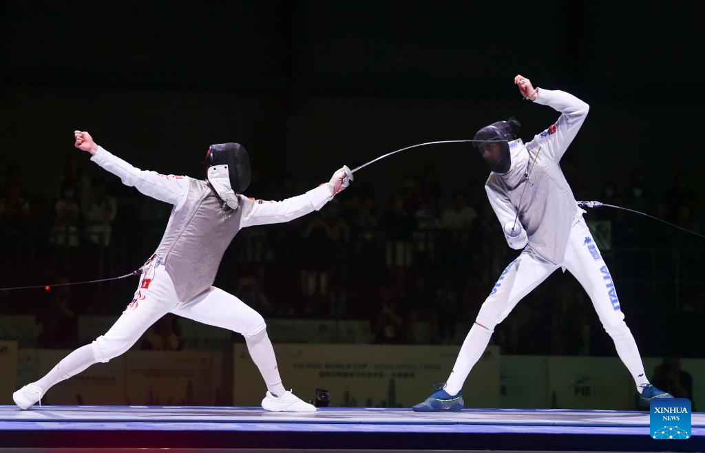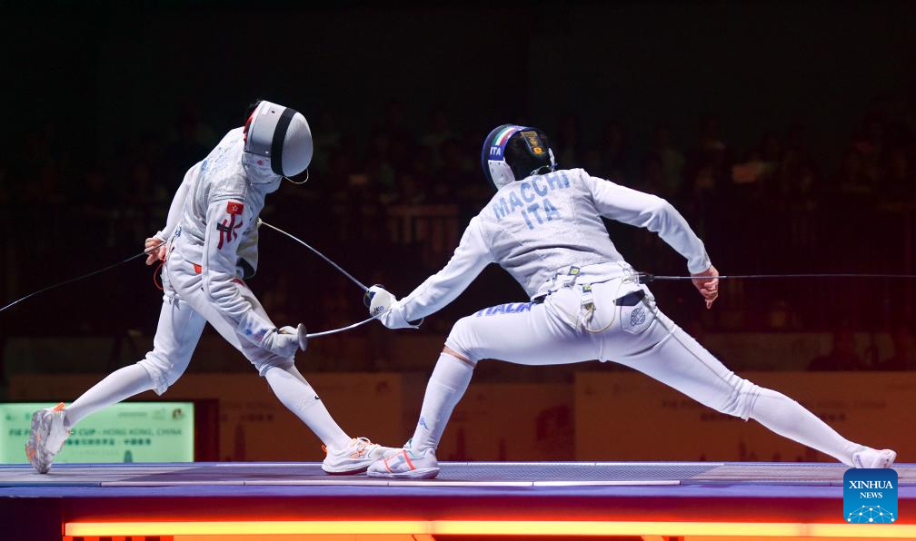 Cheung Ka Long (L) of China's Hong Kong competes against Macchi Tilippo of Italy during the men's senior foil team final at the 2024 FIE Foil World Cup in Hong Kong, south China, May 4, 2024. (Xinhua/Lo Ping Fai)