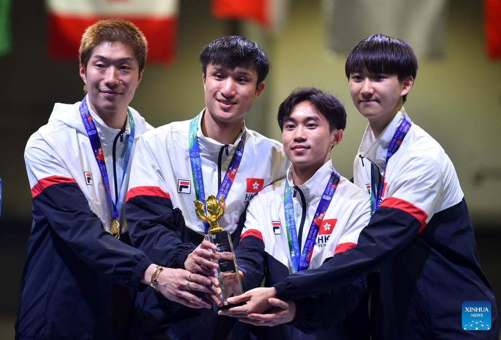 Team China's Hong Kong pose during the awarding ceremony after the men's senior foil team final against Italy at the 2024 FIE Foil World Cup in Hong Kong, south China, May 4, 2024. (Xinhua/Lo Ping Fai)
