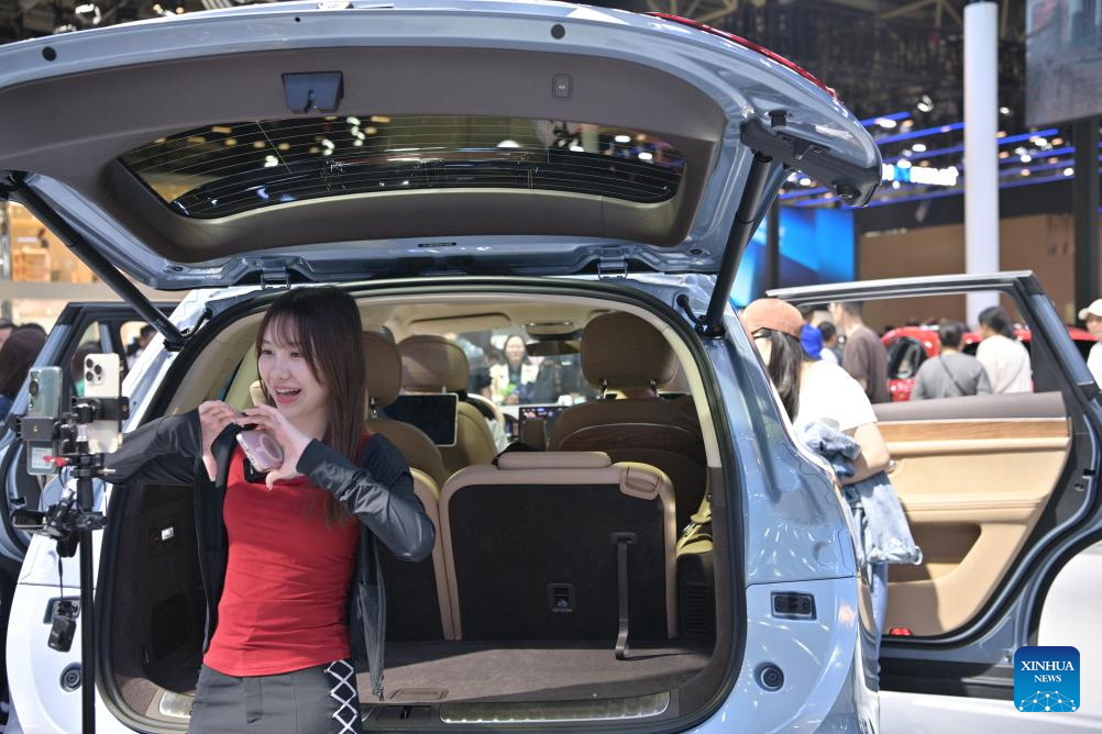 A visitor (R) study a new energy vehicle during the 2024 Beijing International Automotive Exhibition in Beijing, capital of China, May 4, 2024. The exhibition closed on Saturday. (Xinhua/Yin Dongxun)