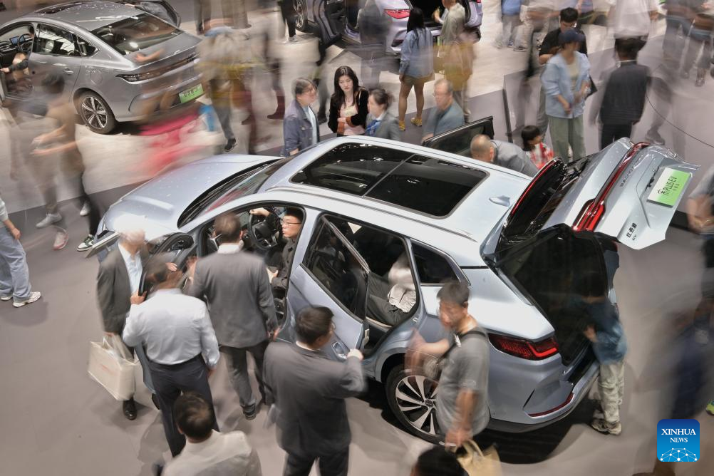 Visitors watch a vehicle of Song PLUS by Chinese NEV manufacturer BYD during the 2024 Beijing International Automotive Exhibition in Beijing, capital of China, May 4, 2024. The exhibition closed on Saturday. (Xinhua/Yin Dongxun)