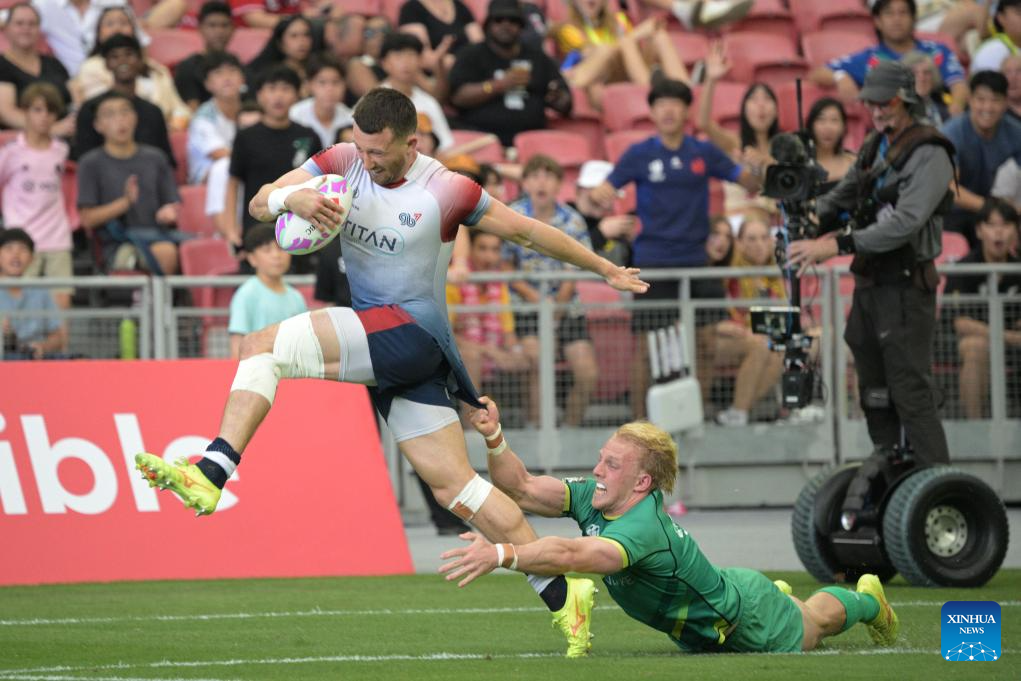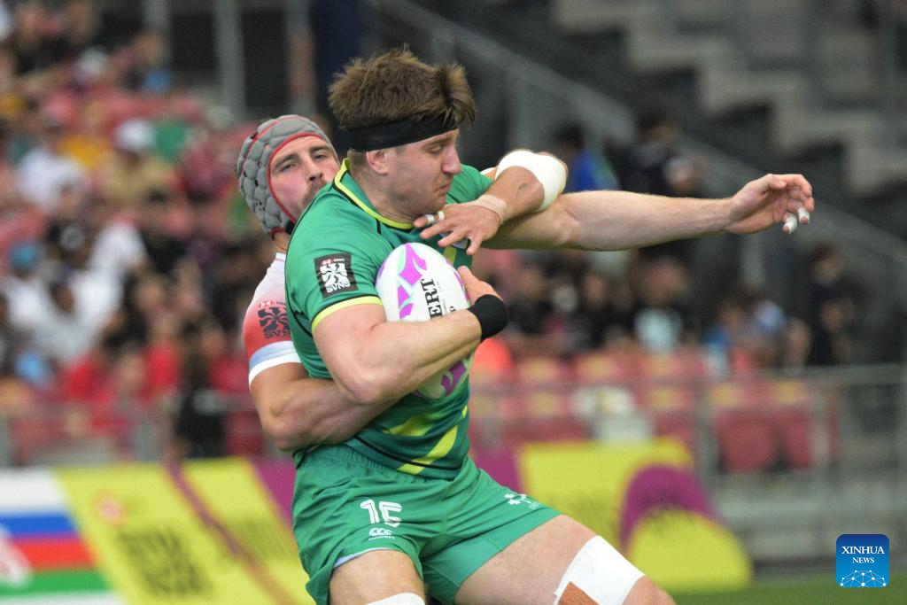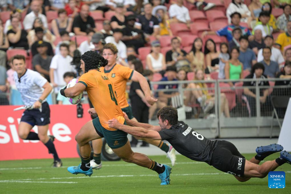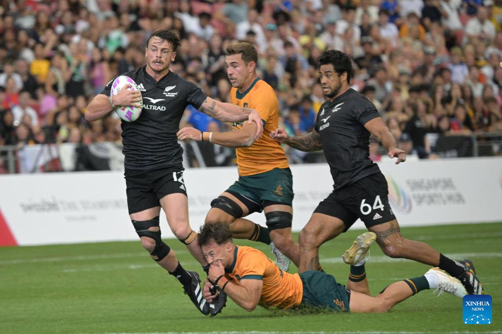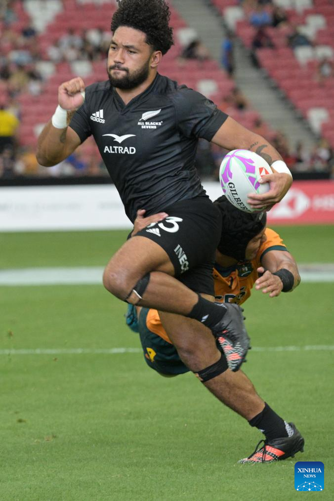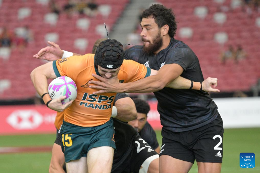 New Zealand's Brady Rush (R) fights for the ball with Australia's James McGregor during the men's semi-finals between New Zealand and Australia at the HSBC Rugby Sevens tournament held in Singapore, on May 5, 2024. (Photo by Then Chih Wey/Xinhua)