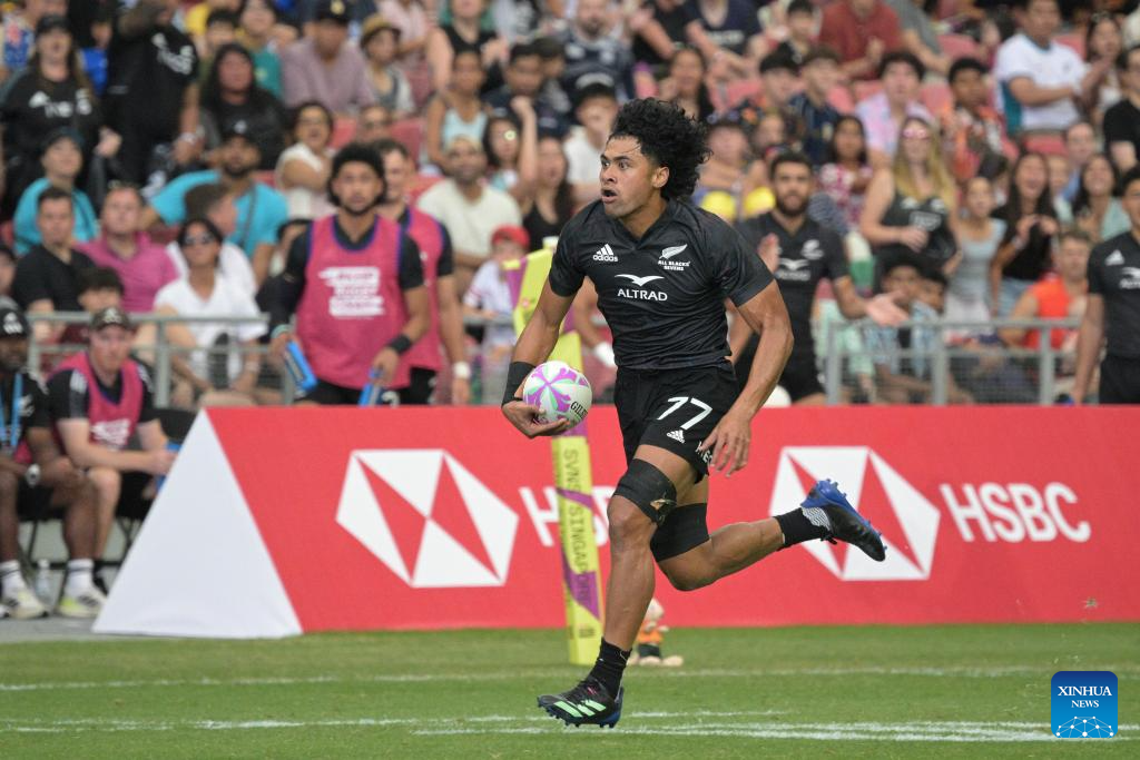 New Zealand's Kitiona Vai runs with the ball during the men's semi-finals between New Zealand and Australia at the HSBC Rugby Sevens tournament held in Singapore, on May 5, 2024. (Photo by Then Chih Wey/Xinhua)