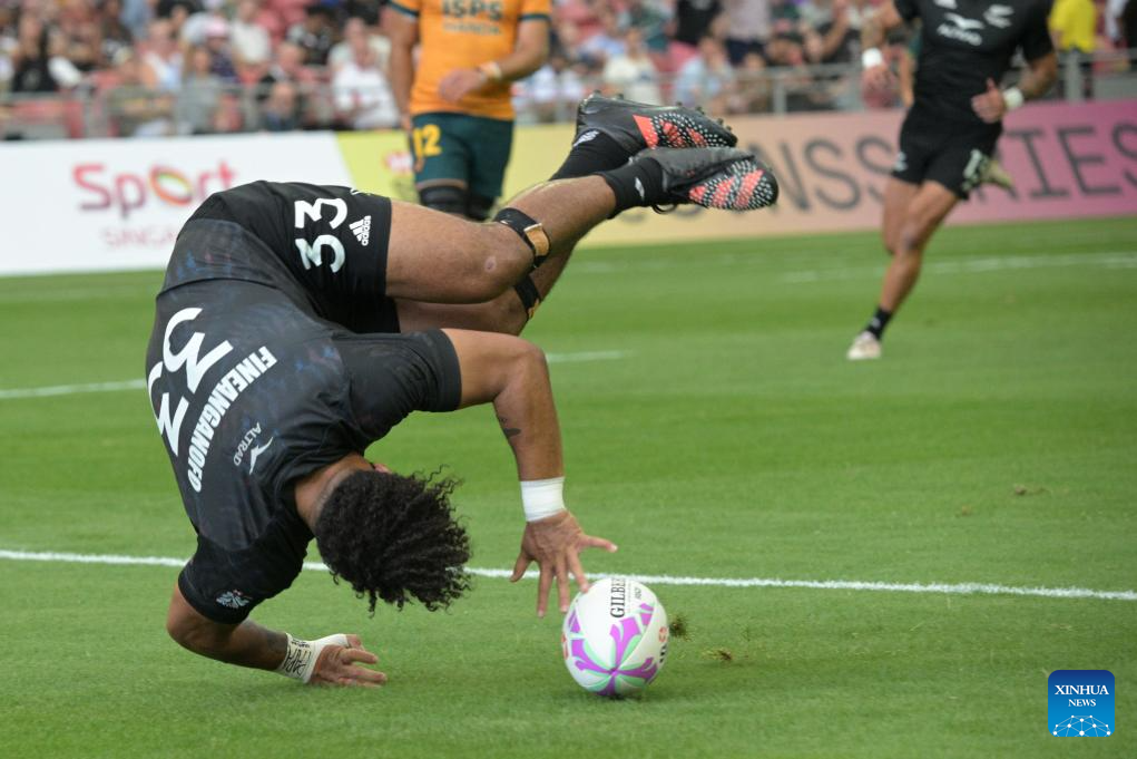 New Zealand's Fehi Fineanganofo scores a try during the men's semi-finals between New Zealand and Australia at the HSBC Rugby Sevens tournament held in Singapore, on May 5, 2024. (Photo by Then Chih Wey/Xinhua)