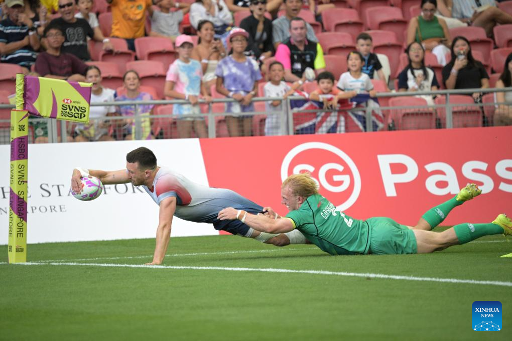 Britain's Alex Davis (L) scores a try during the men's semi-finals between Ireland and Britain at the HSBC Rugby Sevens tournament held in Singapore, on May 5, 2024. (Photo by Then Chih Wey/Xinhua)