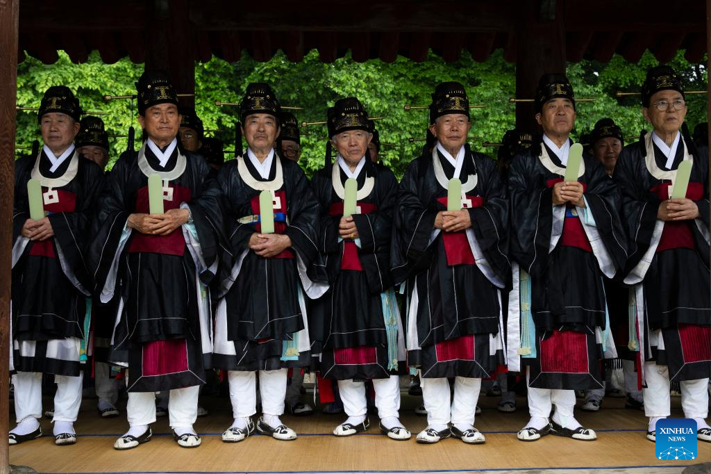 People wearing traditional costumes participate in the "Jongmyo Daeje" ceremony, a royal ancestral rite, at the Jongmyo Shrine in Seoul, South Korea, May 5, 2024. (Photo by Jun Hyosang/Xinhua)