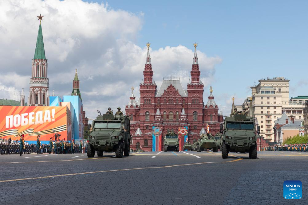 Armored vehicles drive along Red Square during a rehearsal for the Victory Day military parade, which marks the 79th anniversary of the Soviet victory in the Great Patriotic War, Russia's term for World War II, in Moscow, Russia, May 5, 2024. (Xinhua/Bai Xueqi)