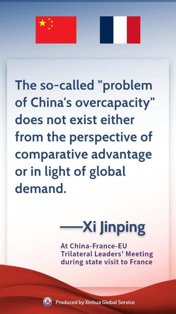 The so-called "problem of China's overcapacity" does not exist either from the perspective of comparative advantage or in light of global demand, Chinese President Xi Jinping told a trilateral meeting of China, France and the EU.
