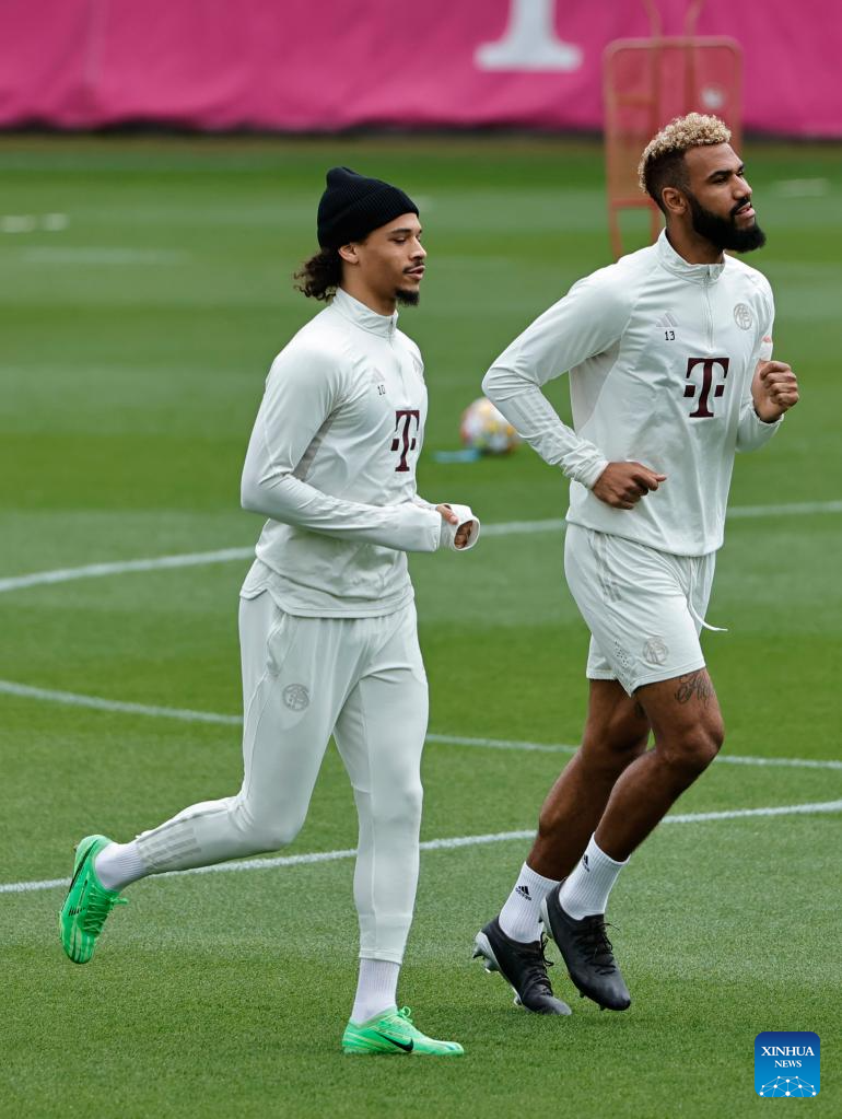 Leroy Sane (L) and Eric Maxim Choupo-Moting of Bayern Munich attend a training session in Munich, Germany, May 7, 2024. Bayern Munich of Germany will play against Real Madrid in the UEFA Champions League semifinal second leg match in Madrid, Spain, on May 8, 2024. (Photo by Philippe Ruiz/Xinhua)
