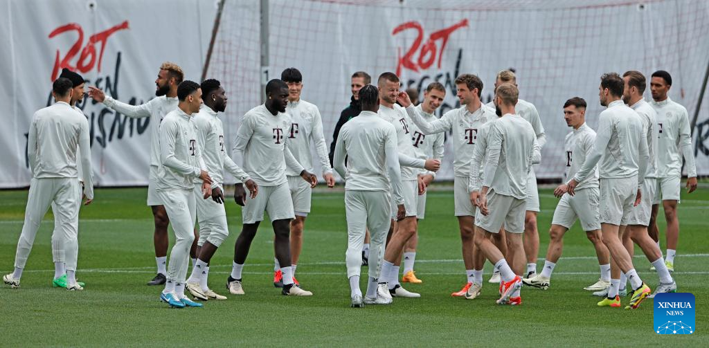 Players of Bayern Munich attend a training session in Munich, Germany, May 7, 2024. Bayern Munich of Germany will play against Real Madrid in the UEFA Champions League semifinal second leg match in Madrid, Spain, on May 8, 2024. (Photo by Philippe Ruiz/Xinhua)