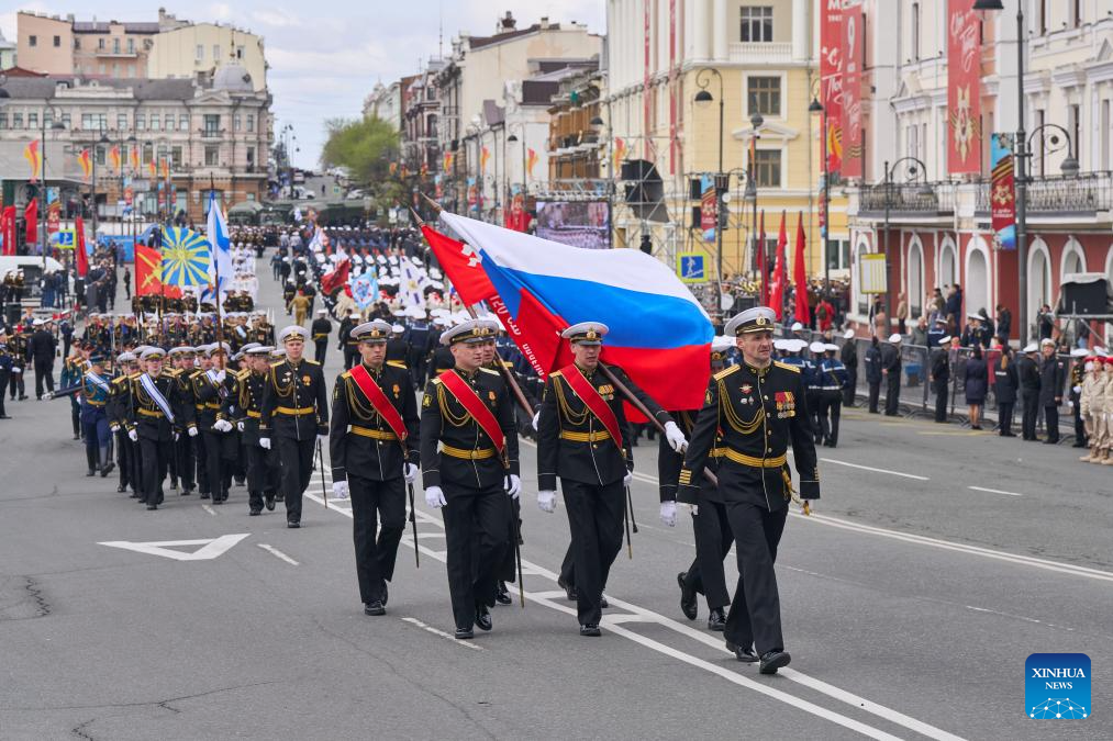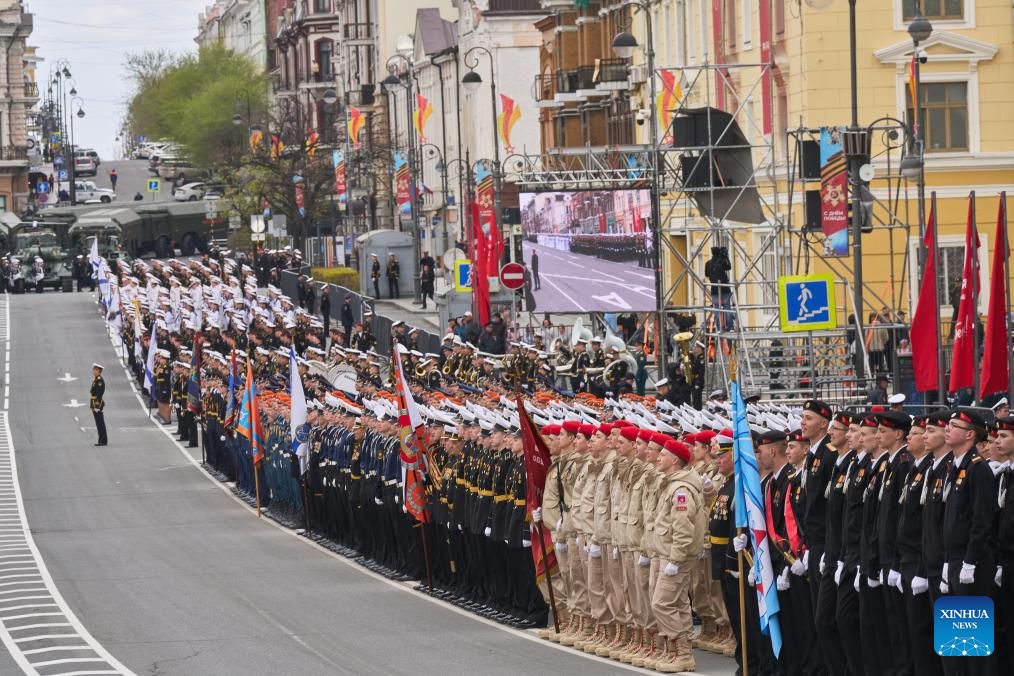 Soldiers attend a rehearsal for the Victory Day military parade, which marks the 79th anniversary of the Soviet victory in the Great Patriotic War, Russia's term for World War II, in Vladivostok, Russia on May 7, 2024. (Photo by Guo Feizhou/Xinhua)
