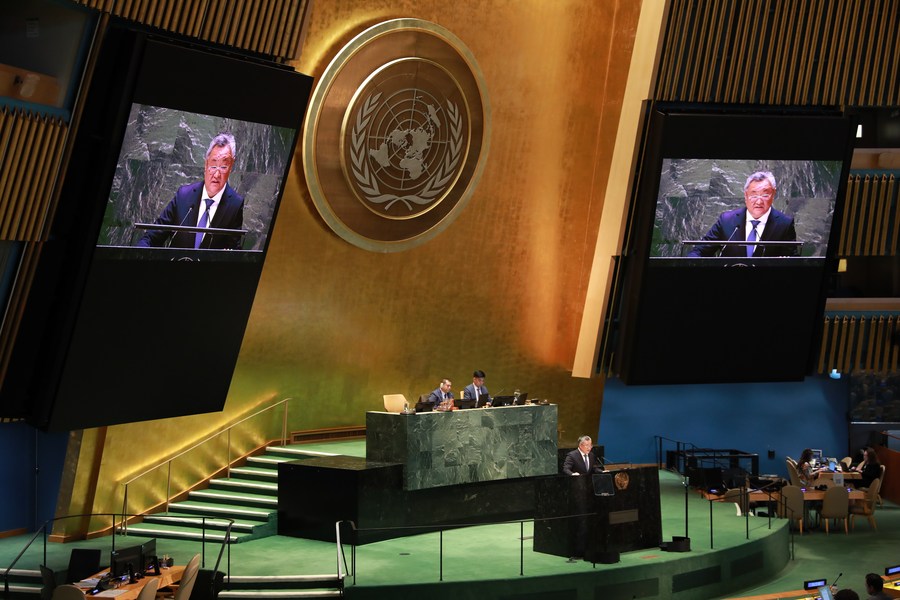 Fu Cong, China's permanent representative to the United Nations, speaks at a UN General Assembly open debate on a draft resolution concerning outer space security vetoed in the Security Council on April 24, at the UN headquarters in New York, May 6, 2024. (Xinhua/Xie E)