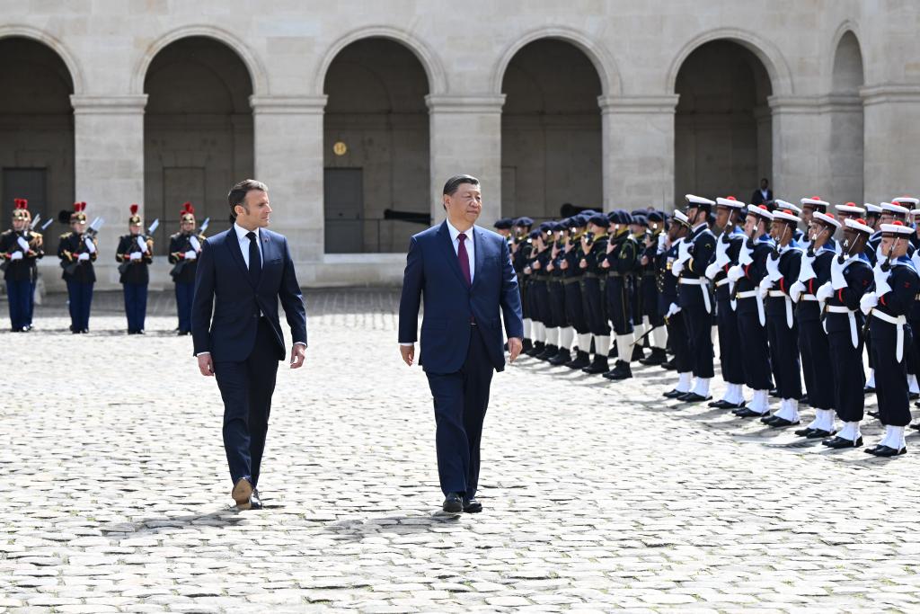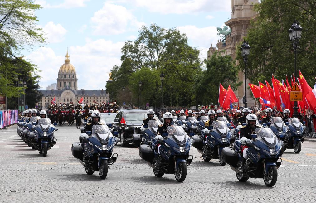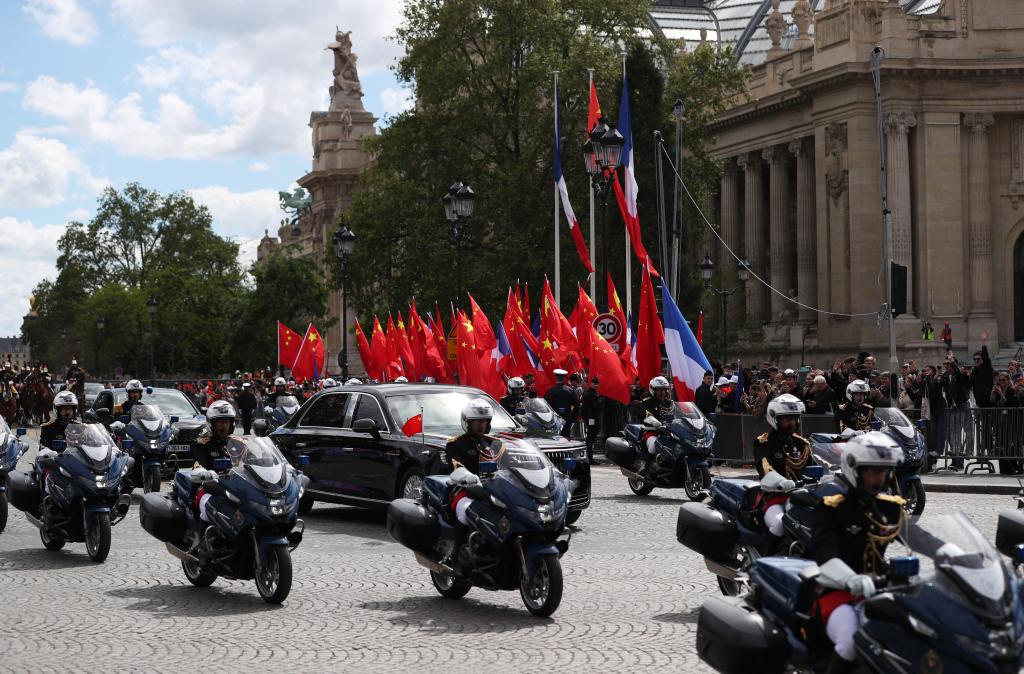 Chinese President Xi Jinping and French President Emmanuel Macron review the French Republican Guard and the guard of honor of the three services in Paris, France, May 6, 2024. Xi, who is on a state visit to France, on Monday attended a welcome ceremony held by Macron. (Xinhua/Xie Huanchi)The motorcade of Chinese President Xi Jinping and his wife Peng Liyuan is escorted by mounted guards and motorcycles to Elysee Palace after a welcome ceremony in Paris, France, May 6, 2024. Xi on Monday attended a welcome ceremony held by French President Emmanuel Macron. (Xinhua/Gao Jing)The motorcade of Chinese President Xi Jinping and his wife Peng Liyuan is escorted by mounted guards and motorcycles to Elysee Palace after a welcome ceremony in Paris, France, May 6, 2024. Xi on Monday attended a welcome ceremony held by French President Emmanuel Macron. (Xinhua/Gao Jing)Chinese President Xi Jinping and French President Emmanuel Macron watch the march-past in Paris, France, May 6, 2024. Xi, who is on a state visit to France, on Monday attended a welcome ceremony held by Macron. (Xinhua/Xie Huanchi)Chinese President Xi Jinping, who is paying a state visit to France, attends a welcome ceremony held by French President Emmanuel Macron, in Paris, France, May 6, 2024. (Xinhua/Xie Huanchi)Chinese President Xi Jinping, who is paying a state visit to France, attends a welcome ceremony held by French President Emmanuel Macron, in Paris, France, May 6, 2024. (Xinhua/Xie Huanchi)