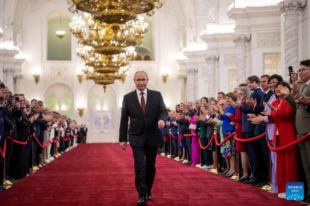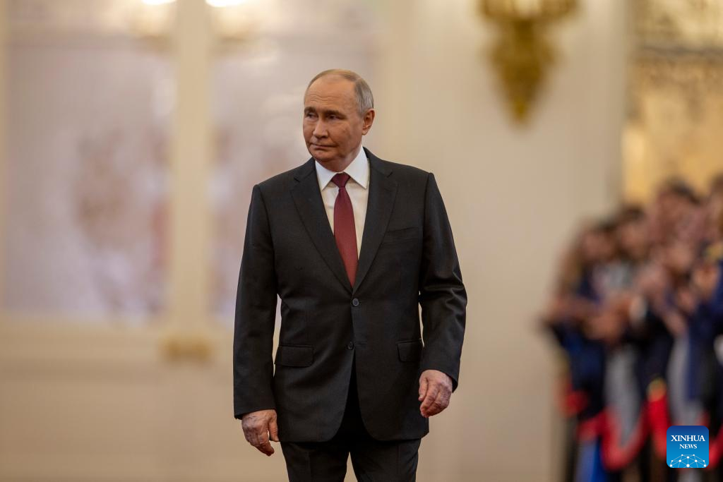 Vladimir Putin attends an inauguration ceremony at the Kremlin in Moscow, Russia, May 7, 2024. Russia will overcome all obstacles and achieve its goals in development, Vladimir Putin said Tuesday when he was sworn in as Russian president. (Xinhua/Cao Yang)