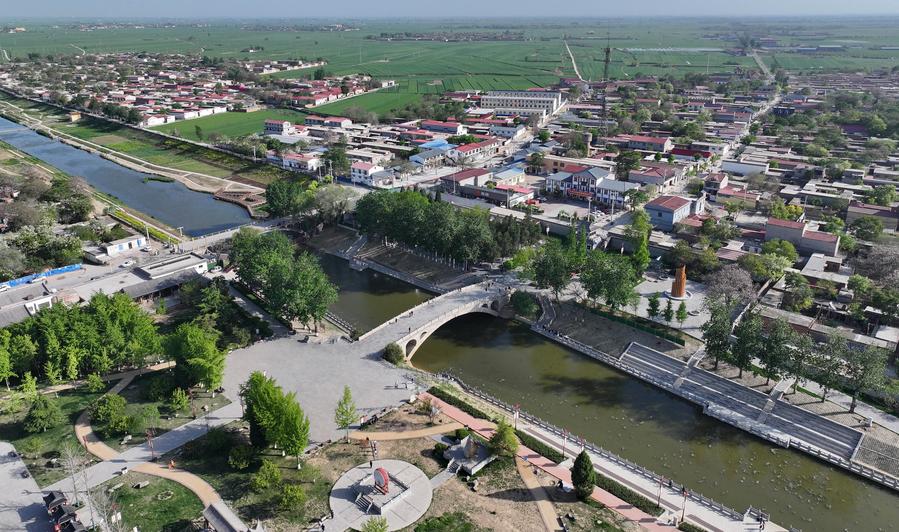 An aerial drone photo taken on April 24, 2024 shows the Zhaozhou Bridge and its surrounding village in Zhaoxian County, north China's Hebei Province. (Xinhua/Mu Yu)