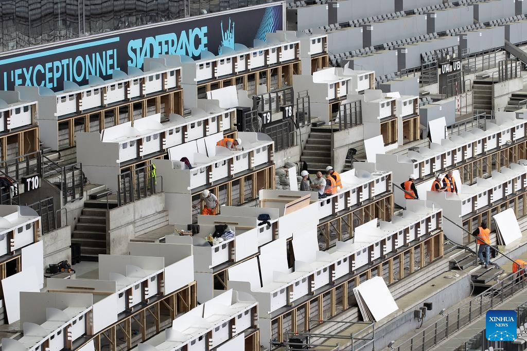 Workers work for the tribune of the Stade de France, in Paris, France, on May 7, 2024. (Xinhua/Xu Zijian)