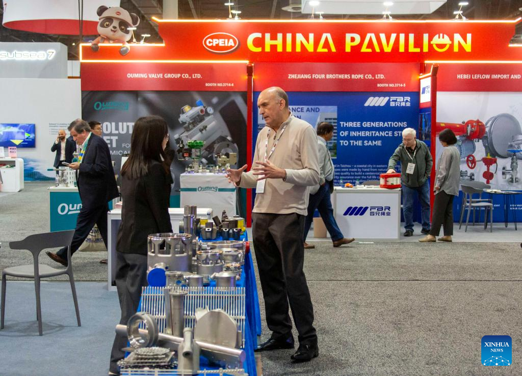 Attendees have a talk at the Offshore Technology Conference (OTC) 2024 in Houston, Texas, the United States, May 6, 2024. This year's OTC is held here from May 6 to 9. (Photo by Chengyue Lao/Xinhua)