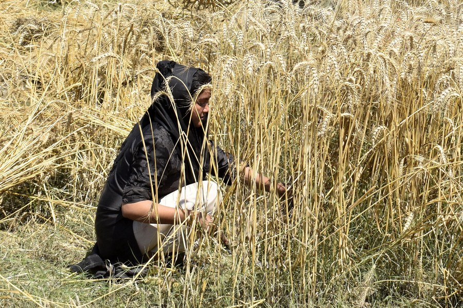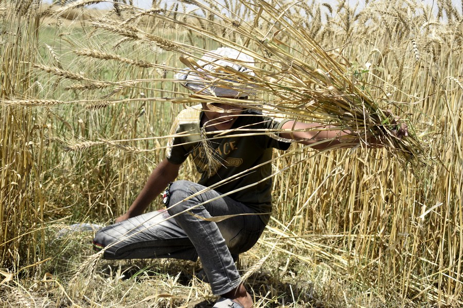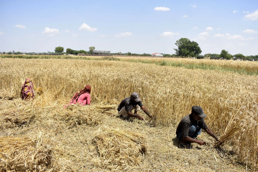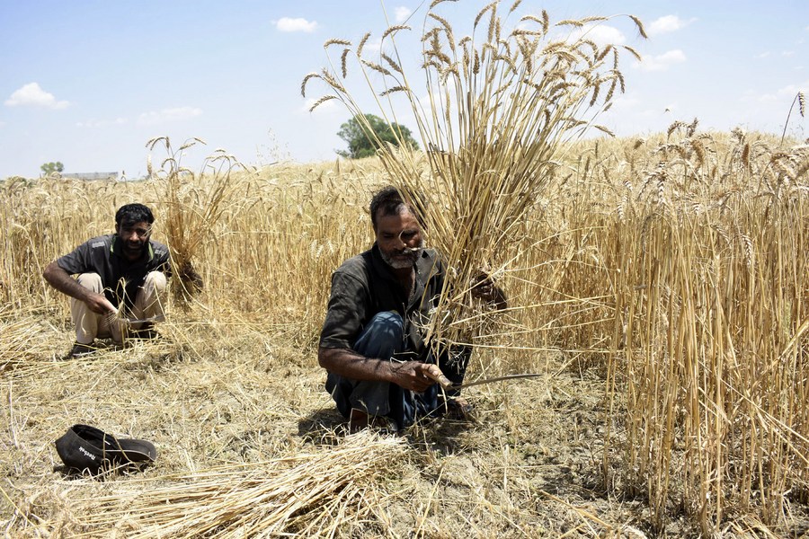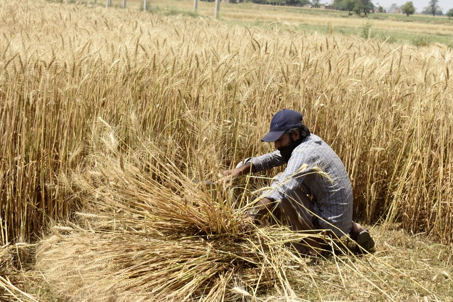 A farmer harvests wheat at a field on the outskirts of Lahore, Pakistan on May 8, 2024. (Photo by Sajjad/Xinhua)