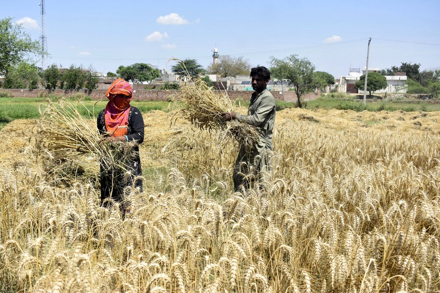 Farmers harvest wheat at a field on the outskirts of Lahore, Pakistan on May 8, 2024. (Photo by Sajjad/Xinhua)