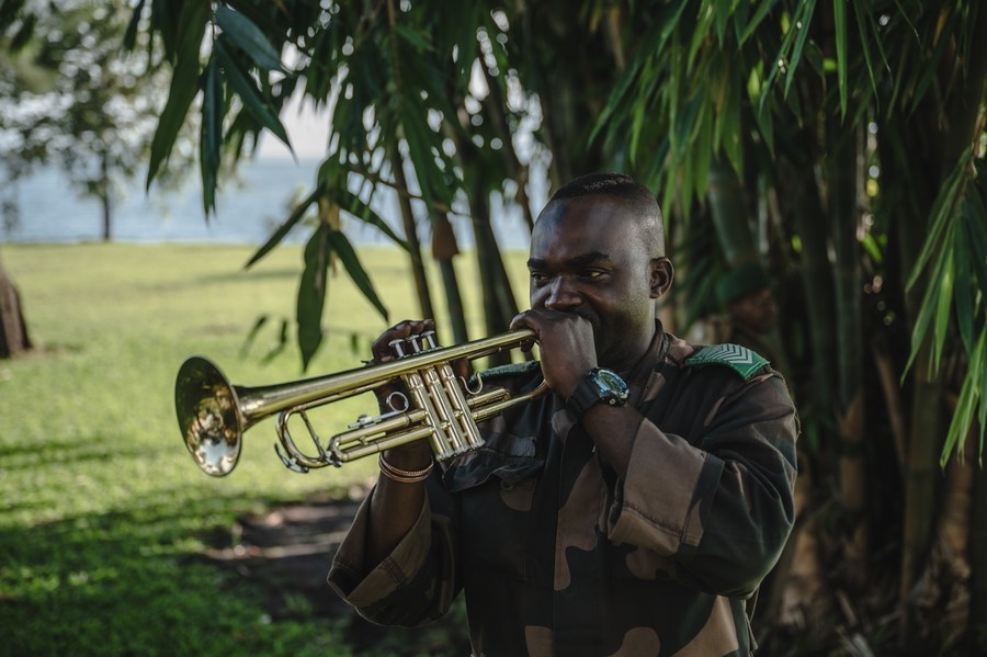 Photo taken on April 11, 2024, shows a soldier of the Congolese Army playing the trumpet in Goma, North Kivu province, eastern Democratic Republic of the Congo (DRC). (Xinhua/Wang Guansen)