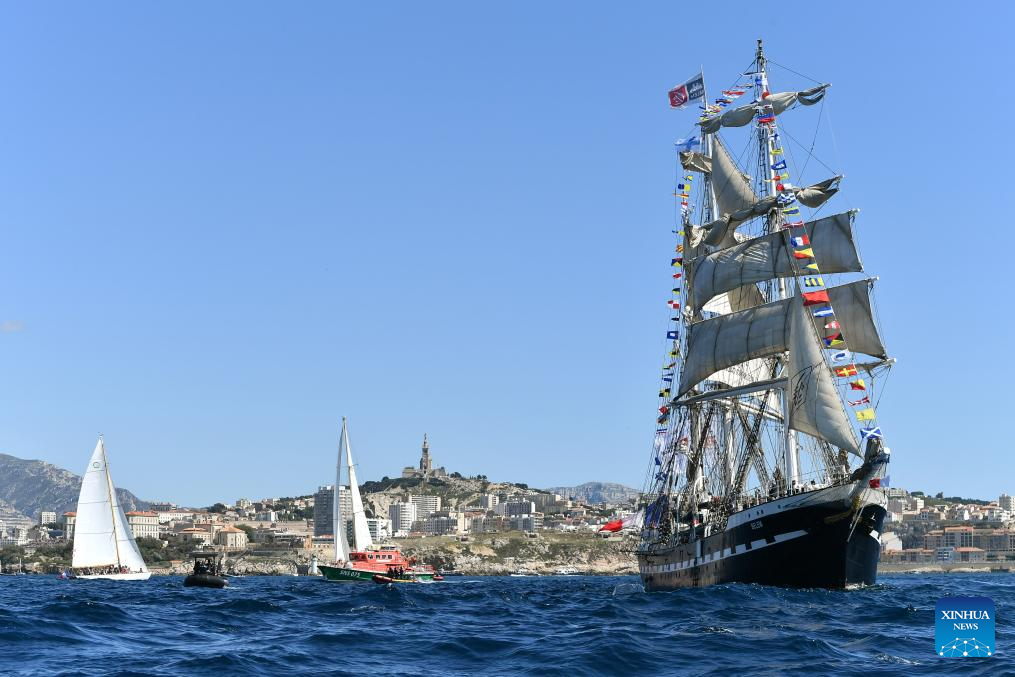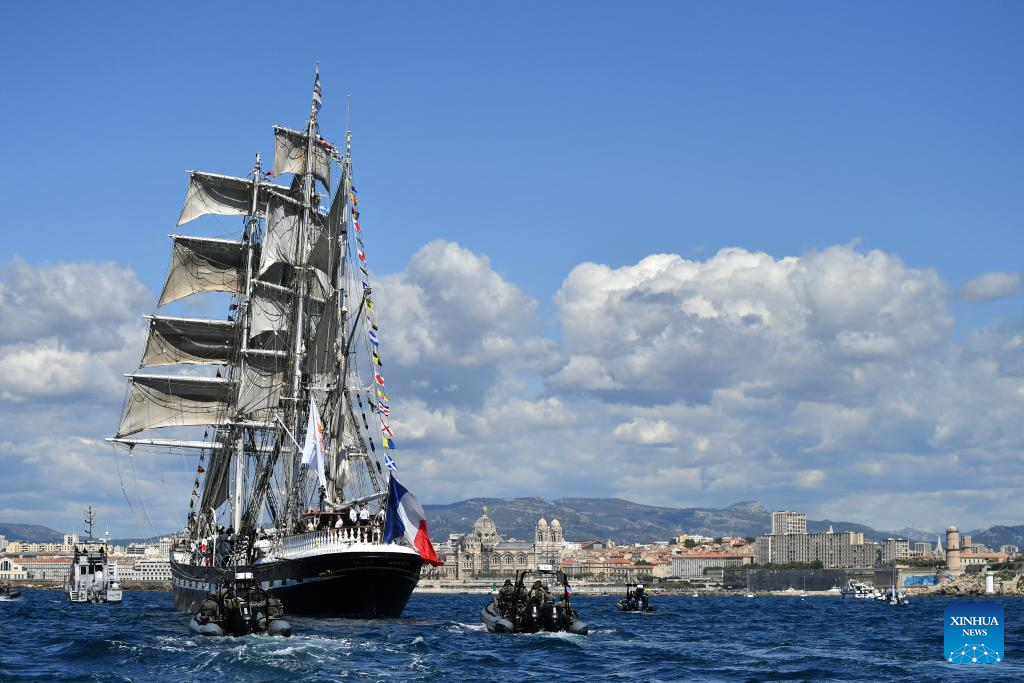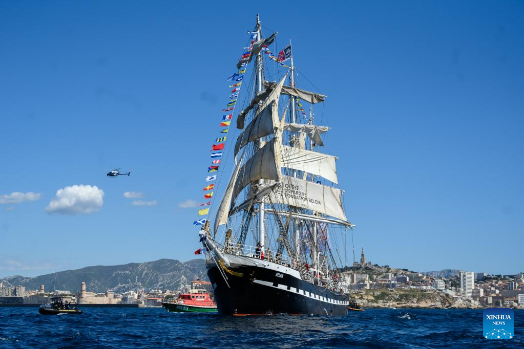 The Belem, a three-masted sailing ship carrying the Olympic flame, arrives in the southern French city of Marseille on May 8, 2024. (Photo by Julien Mattia/Xinhua)