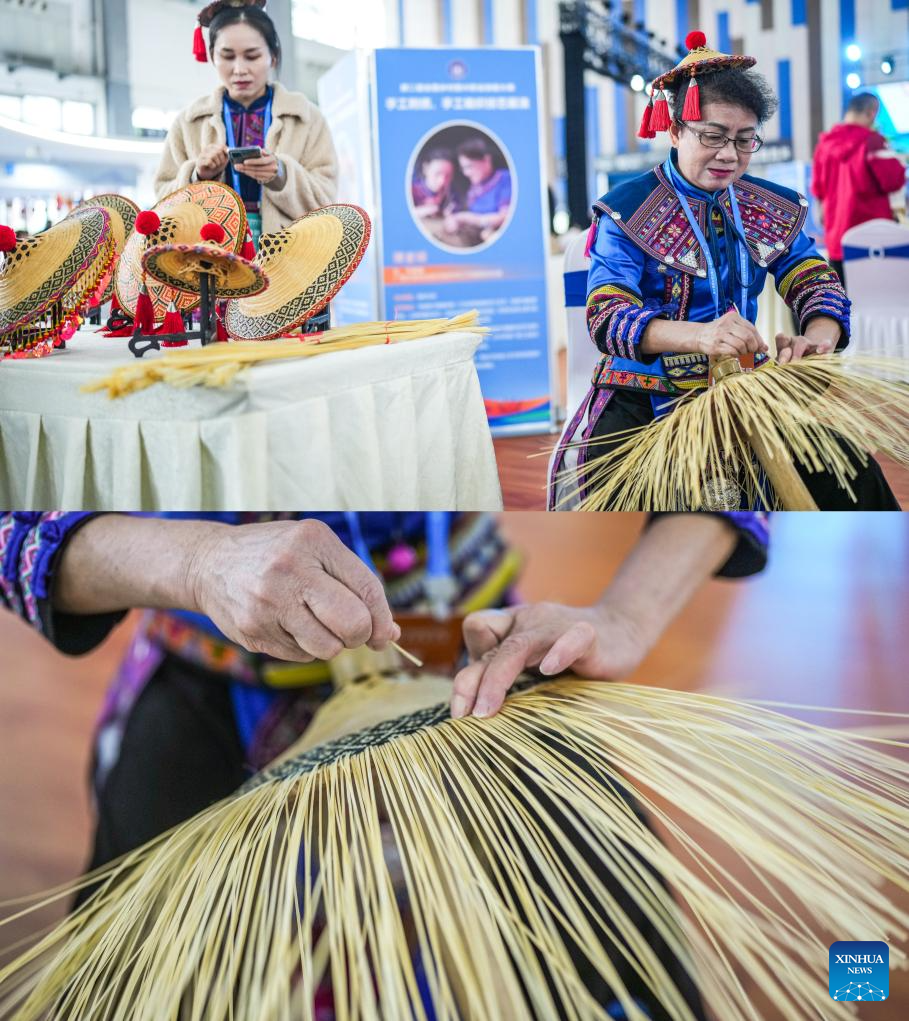 This combo photo shows Sun Yaqing making a weaving product in Guiyang, southwest China's Guizhou Province, May 8, 2024. During a national vocational skills competition held recently in Guiyang, 52 artisans from across the country gather to bring diverse handicrafts to the audience. (Xinhua/Tao Liang)