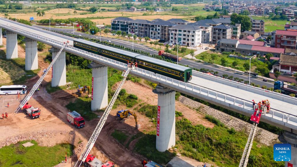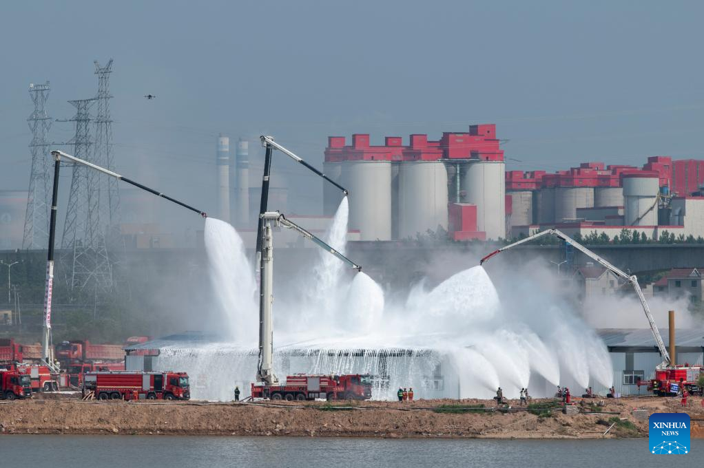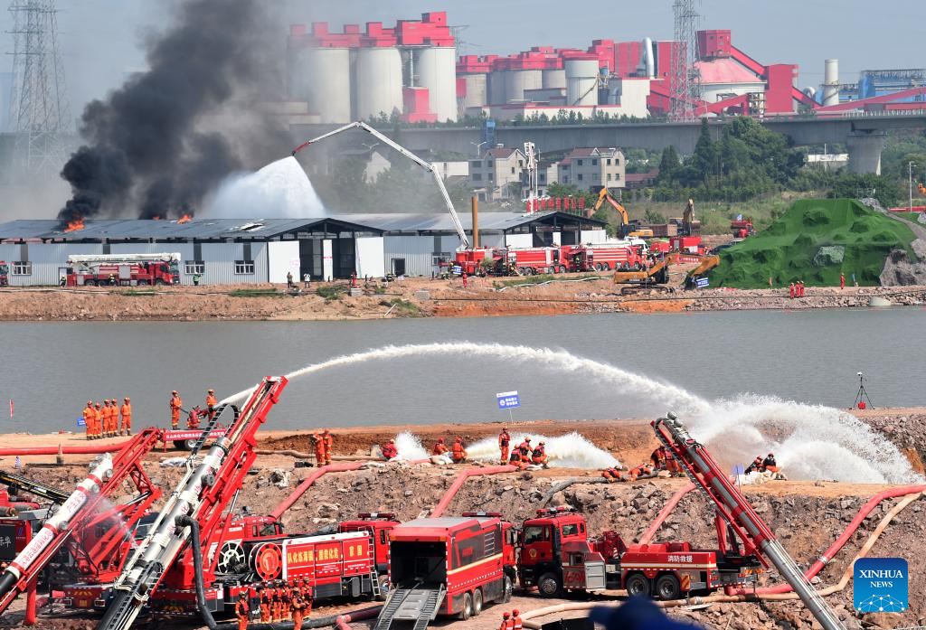 Around 8,000 emergency response personnel, four helicopters, one drone and various departments associated with maritime, railway, aviation and road operations took part in the exercise. (Photo by Hu Xiaofei/Xinhua)