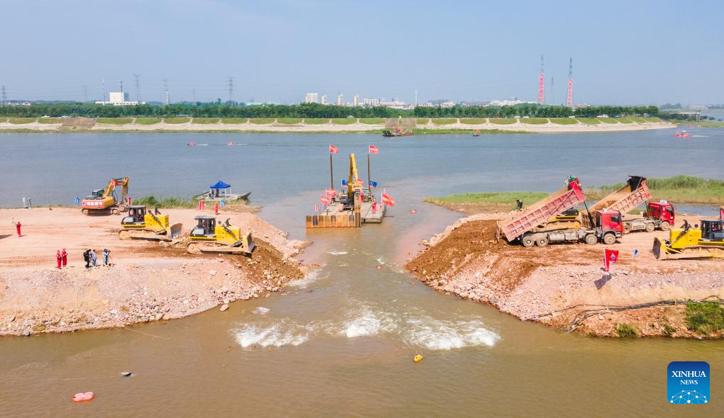 An aerial drone photo taken on May 10, 2024 shows emergency response personnel conducting operations at a breached embankment during a drill in Jinhua City, east China's Zhejiang Province. A drill focusing on mitigation, emergency response and disaster relief for super typhoons and major floods was held in east China's Zhejiang Province on Friday.